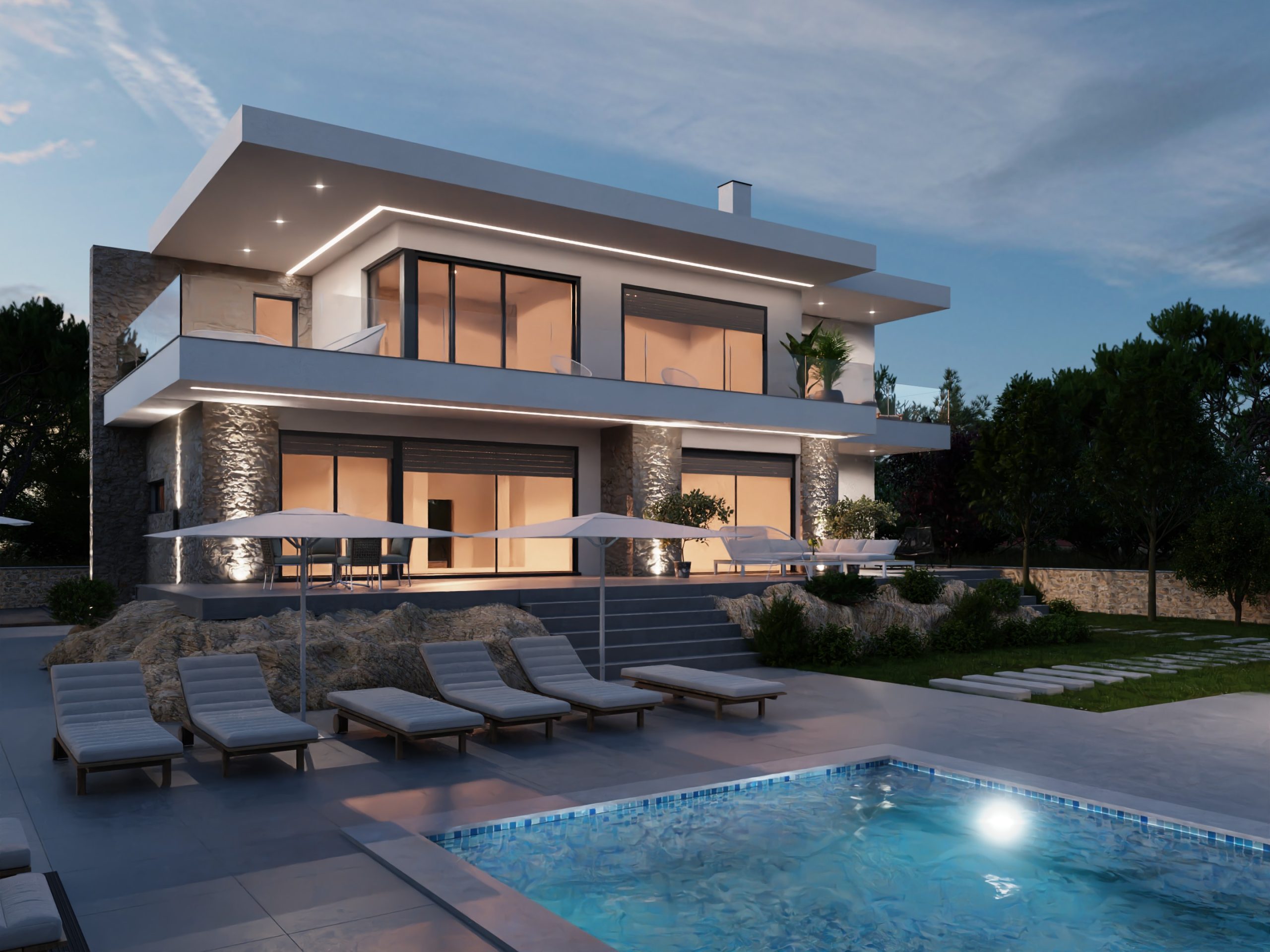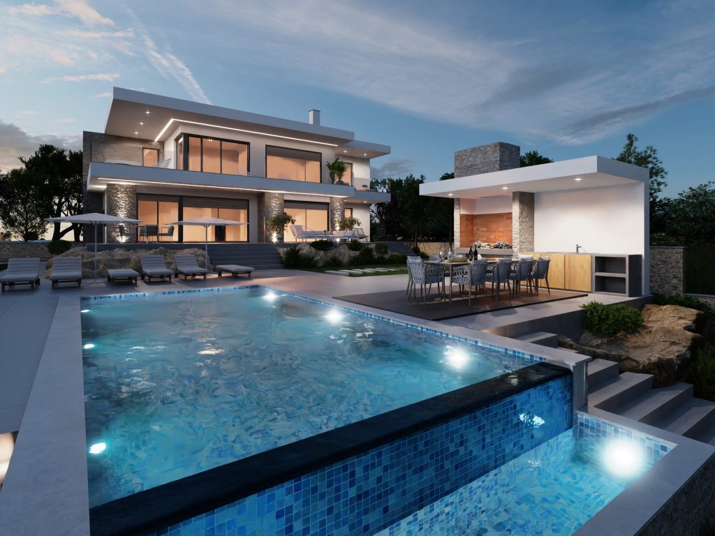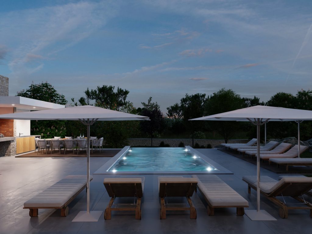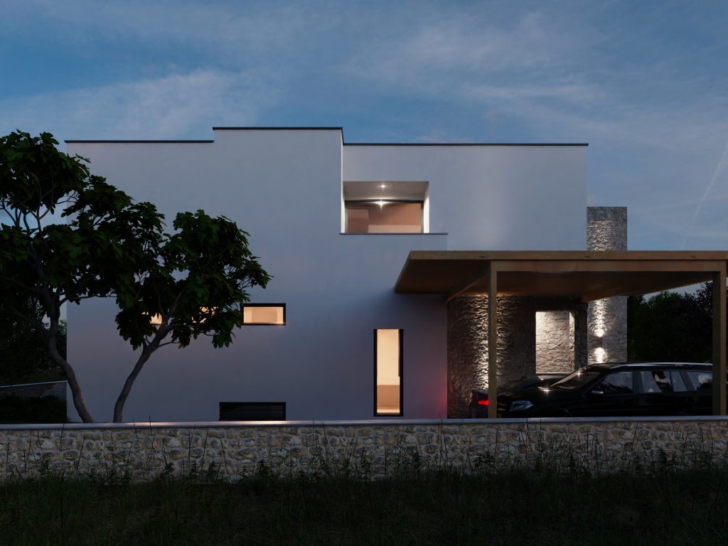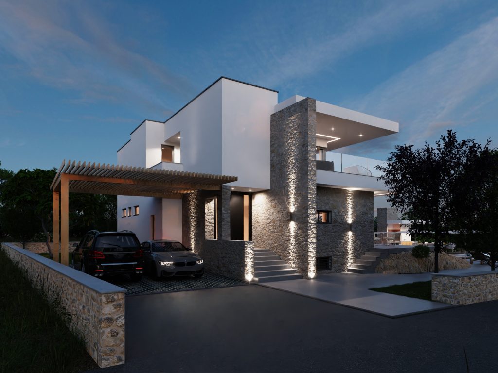 Projekt uključuje modernu obiteljsku vilu s bazenom, garažom, četiri spavaće sobe, četiri kupaonice, prostranim terasama i uređenim okolišem. Vila je zamišljena kao funkcionalan i elegantan prostor za ugodan život ili luksuzni turizam.