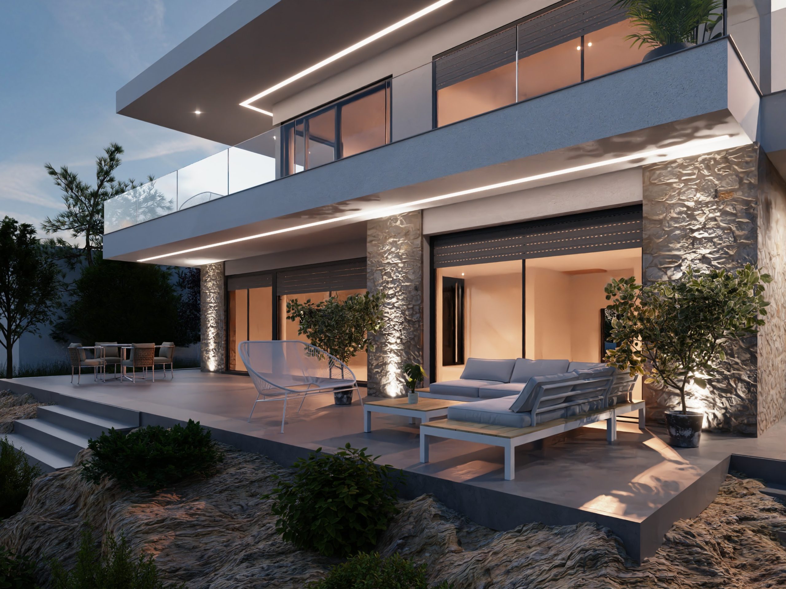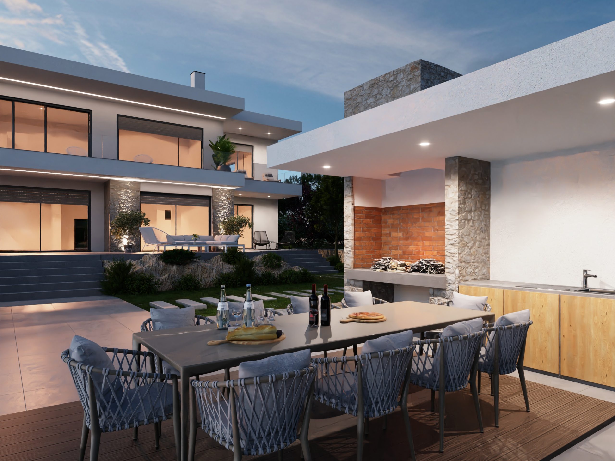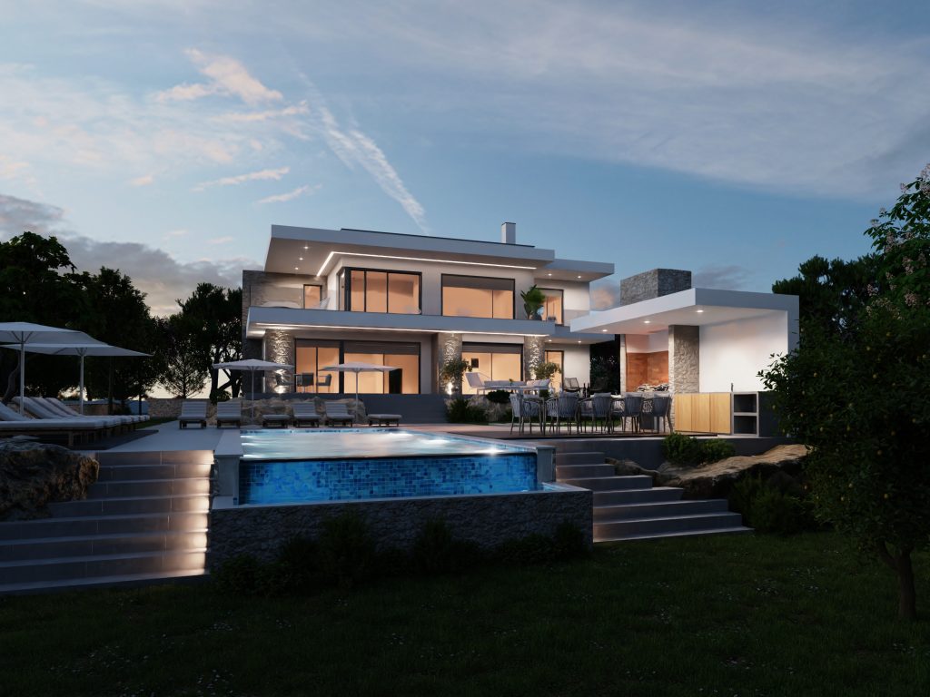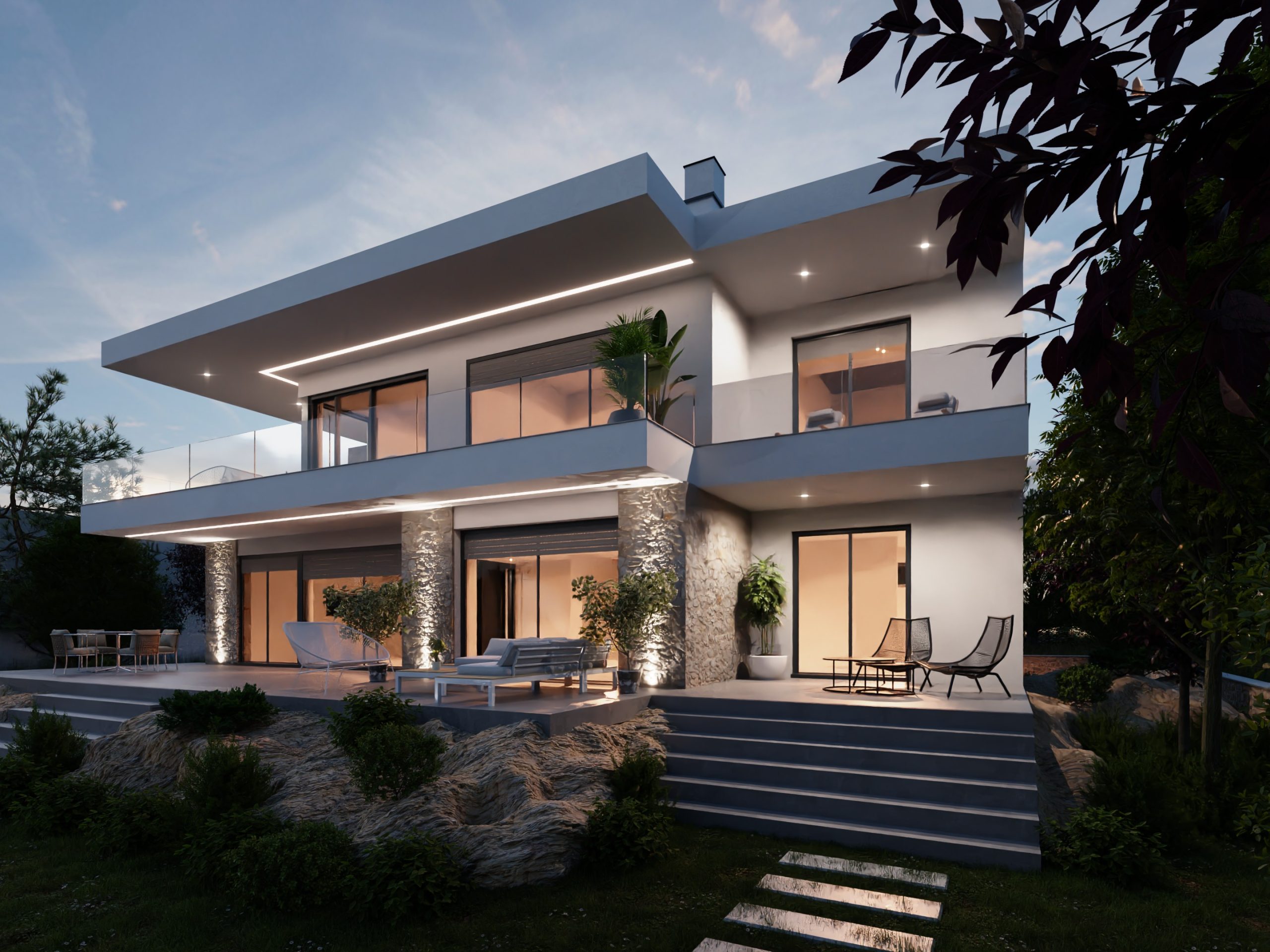 Projekt uključuje modernu obiteljsku vilu s bazenom, garažom, četiri spavaće sobe, četiri kupaonice, prostranim terasama i uređenim okolišem. Vila je zamišljena kao funkcionalan i elegantan prostor za ugodan život ili luksuzni turizam.
